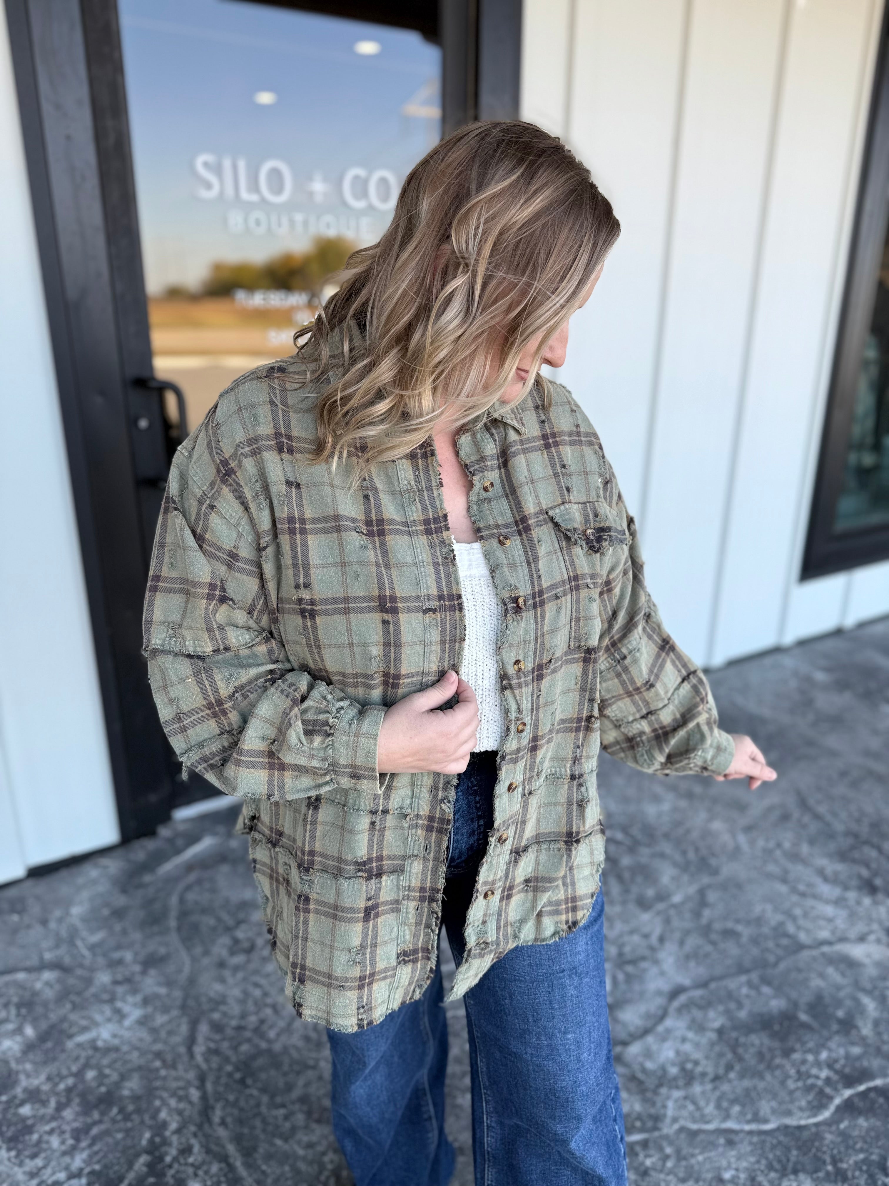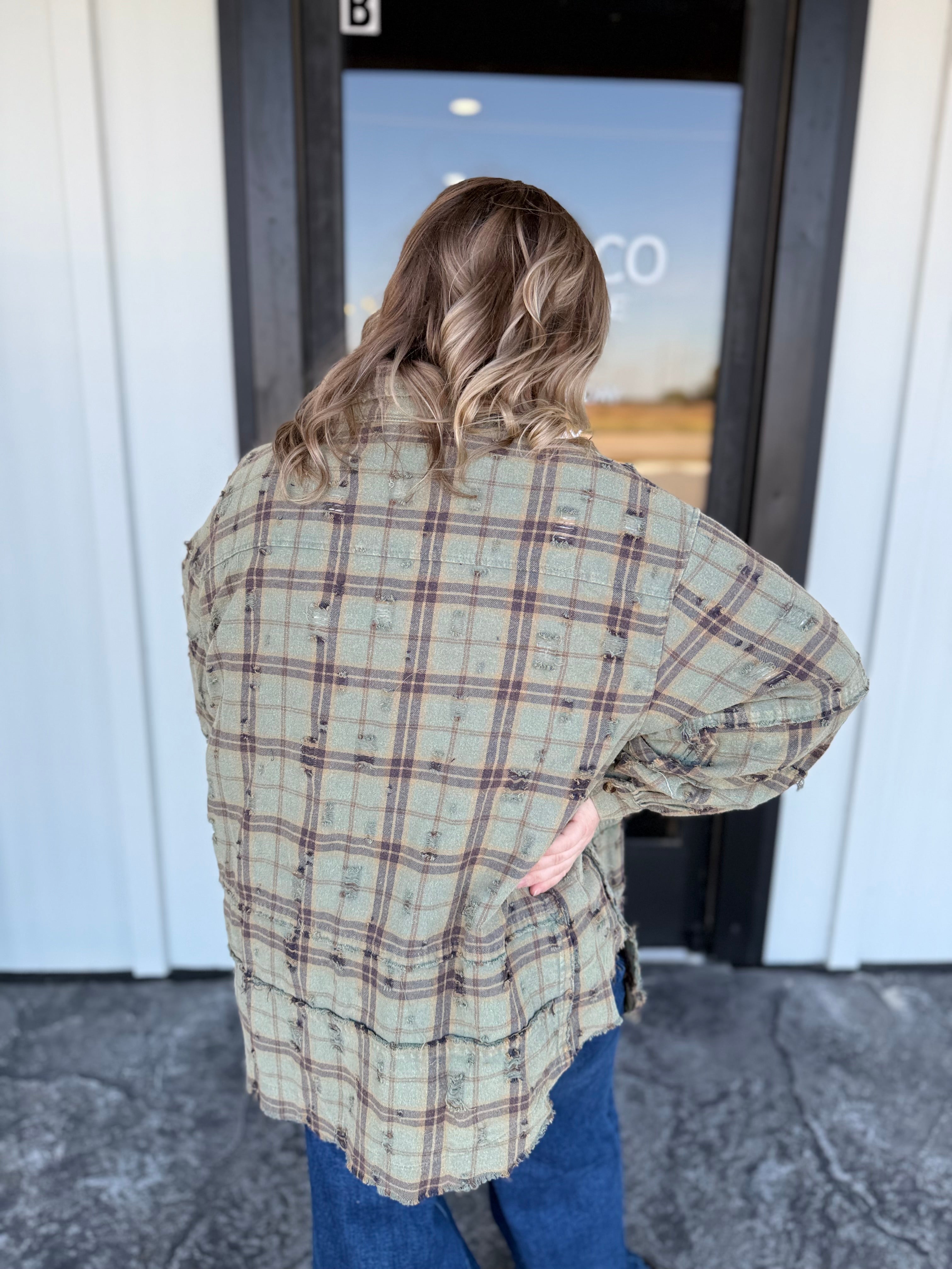 Throw on this oversized distressed flannel for instant cool-girl energy. The dusty sage hue pairs effortlessly with everything in your closet—layer it over basics, tie it at the waist, or wear it solo. Soft, slouchy, and unapologetically lived-in, this flannel is your new go-to for that perfectly imperfect vibe. Perfect for coffee runs, weekend hangs, or just looking like you didn't try (but totally did).