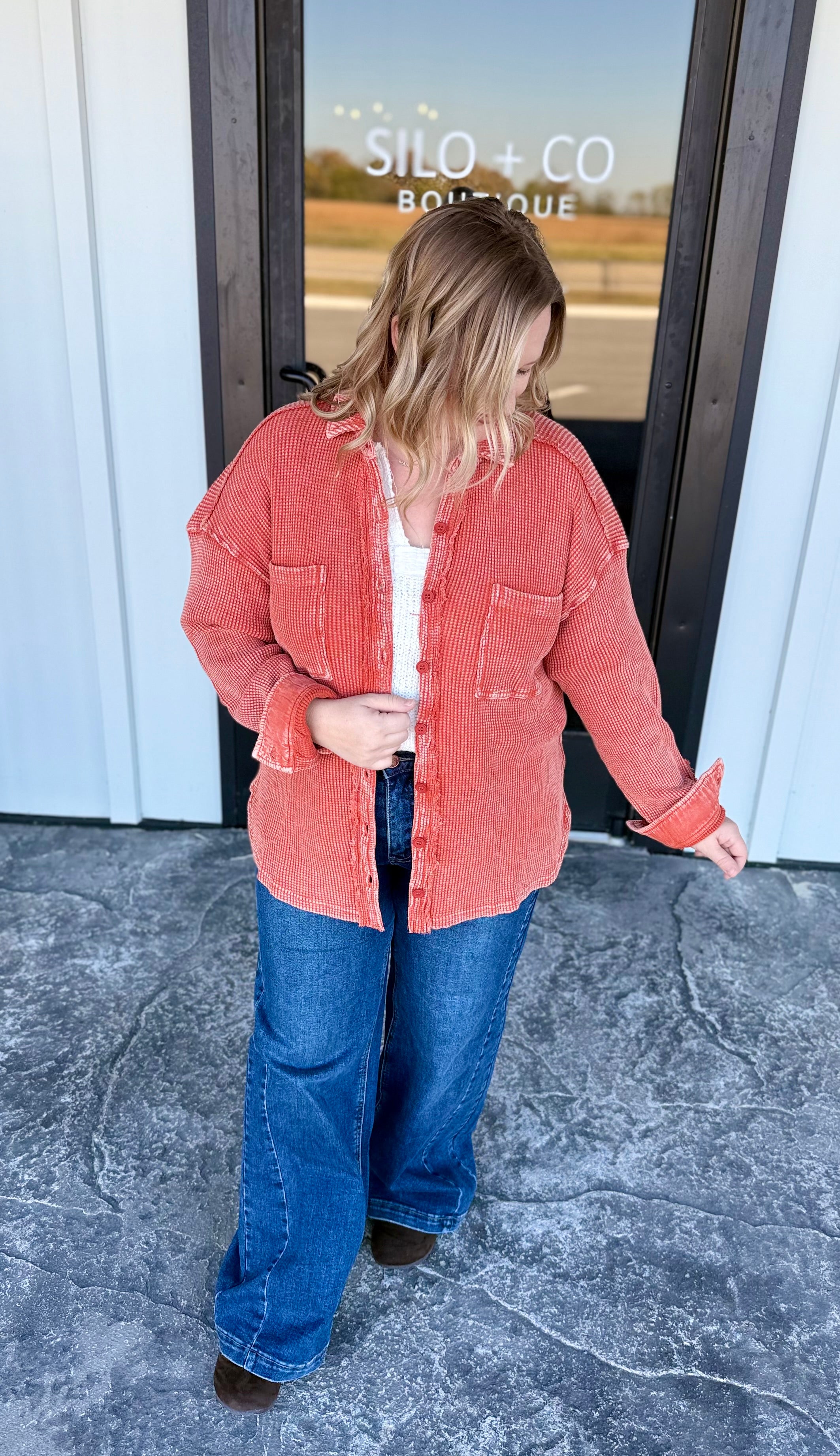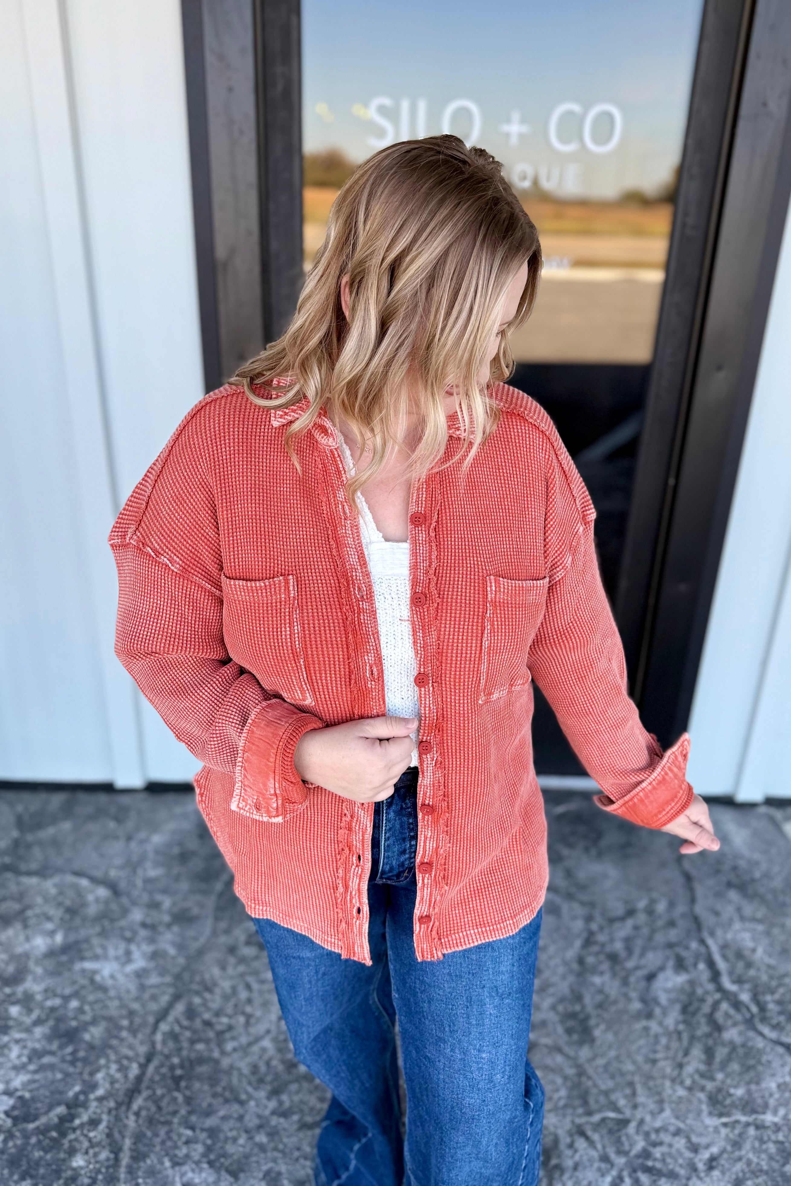 Perfect for those crisp-weather days when a regular shirt just won't cut it. This rust-colored henley shacket bridges the gap between cozy and put-together, giving you that effortless layering piece that works over tees or under jackets. The classic henley texture adds a touch of vintage charm, while the structured shacket silhouette keeps things modern and versatile. Throw it on, button it up, or leave it open—this wardrobe workhorse adapts to your vibe and your temperature needs.