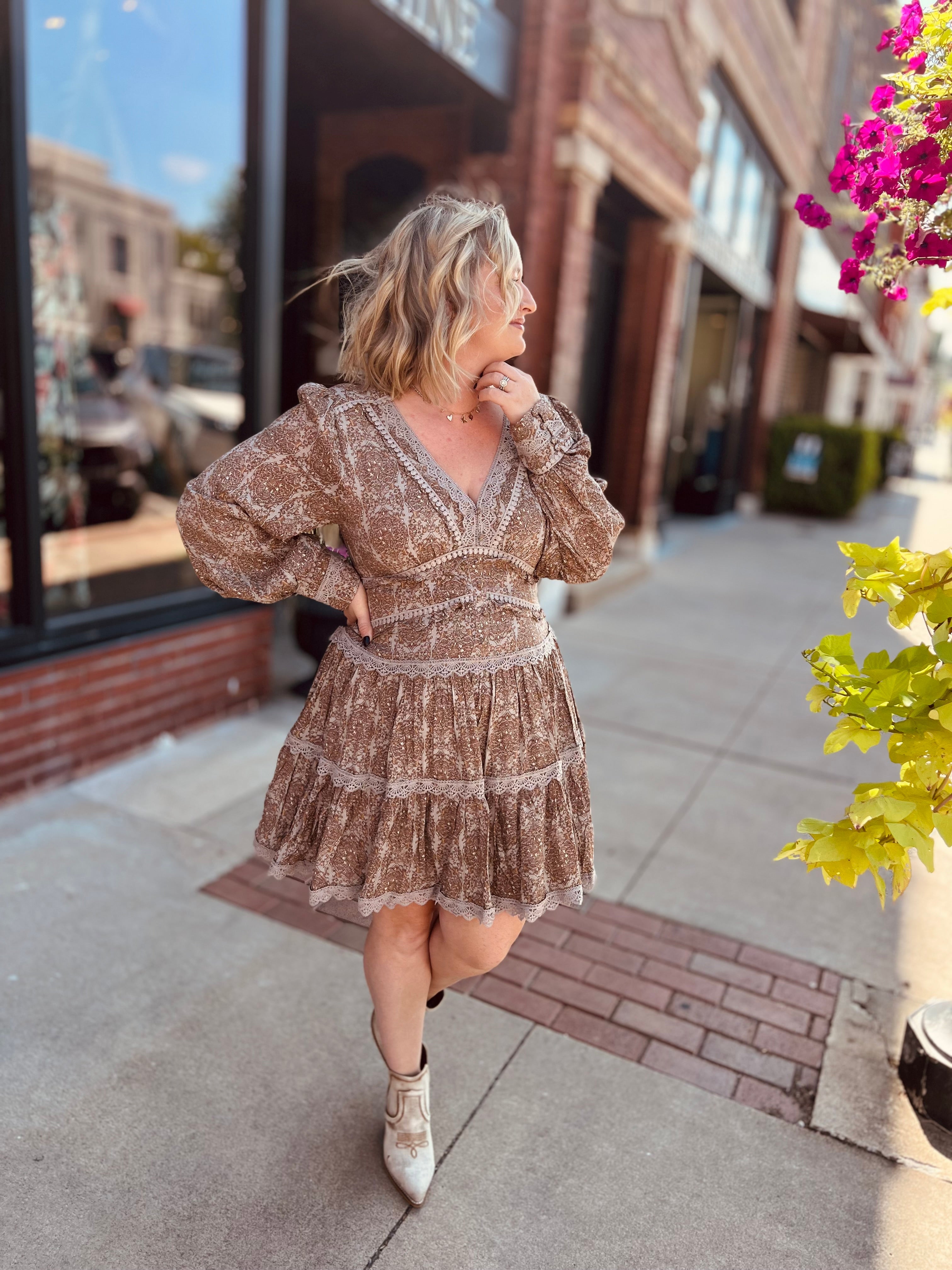 Effortlessly achieve the perfect fall look with our Kick up the Dust Dress. This versatile piece is perfect for weddings or concerts, providing a touch of elegance and trendiness to any occasion. Don't miss out on capturing those fall vibes in style.